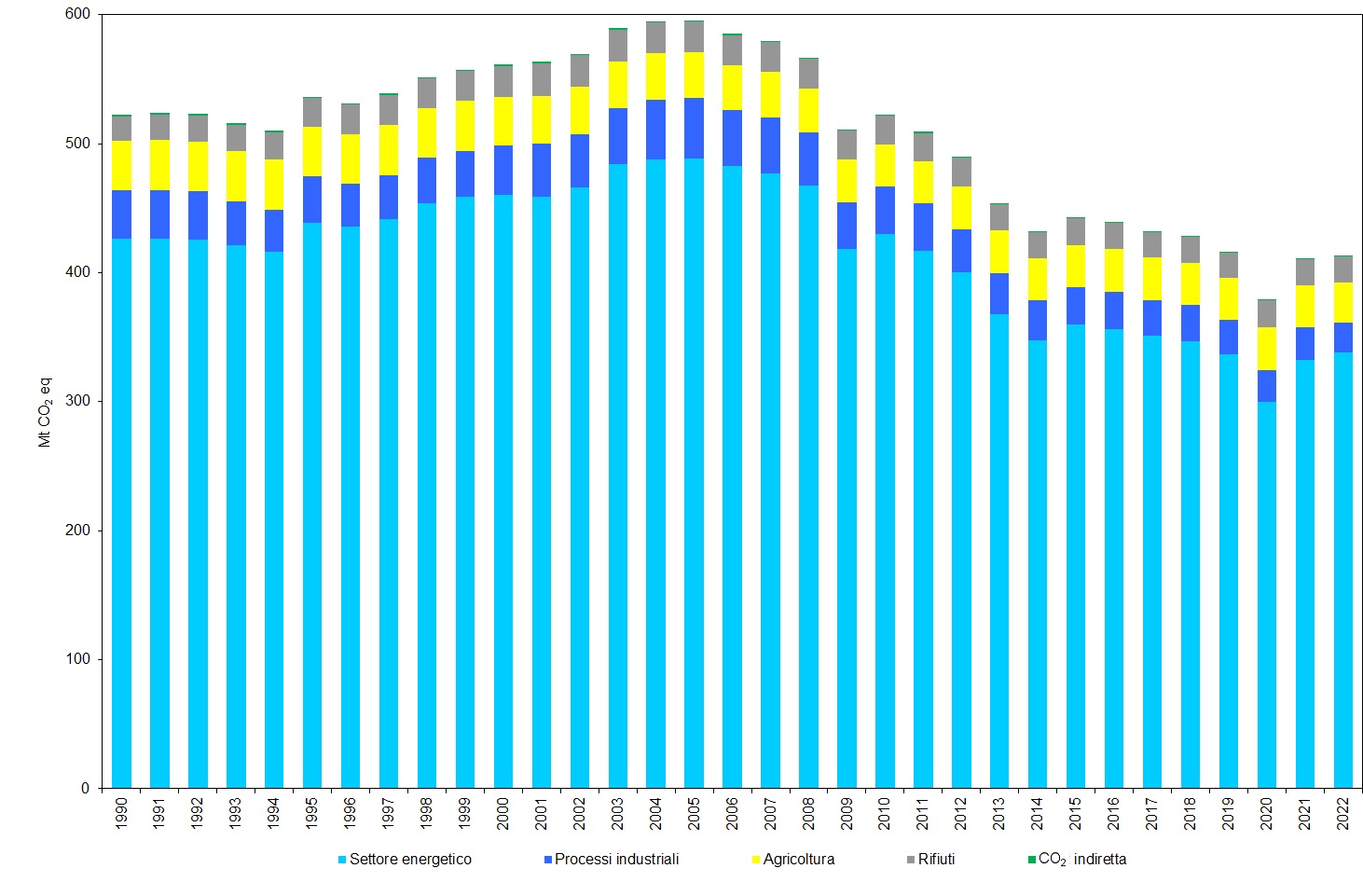 Nel 2022 le emissioni sono risultate inferiori del 21% rispetto al 1990: questa riduzione è stata favorita da una recente frenata economica che ha diminuito i consumi, ma anche dalla crescita dell’uso di energie rinnovabili, che ha ridotto del 20% le emissioni di CO₂ legate al settore energetico.