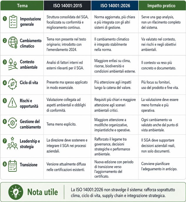 Abbiamo riassunto in modo semplice e diretto le principali differenze tra ISO 14001:2015 e ISO 14001:2026.